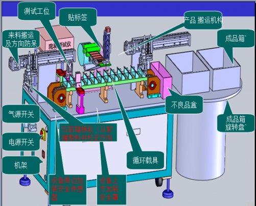 2. 通過後端測試機上搬運機(jī)構將其搬運至循環載具上(shàng)(方向錯誤旋轉),載具移動一個工位(wèi),並觸發測試儀進行測試(shì),(增加熱縮管漏裝檢測)判斷產(chǎn)品OK後打印標簽紙,(不良品放(fàng)入不良品盒)