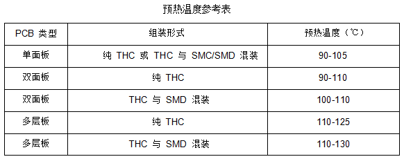 印製板預熱溫度和時間(jiān)要根據印製板的大小、厚度、元器件(jiàn)的大小(xiǎo)和多少、以及貼(tiē)裝元器件的多少來確定。預熱溫(wēn)度在 90-130℃(PCB 表(biǎo)麵溫度),多層板以及有(yǒu)較多貼(tiē)裝元器件時預熱溫度取上限,不同 PCB 類型和(hé)組裝形式的預熱溫度參考下表。